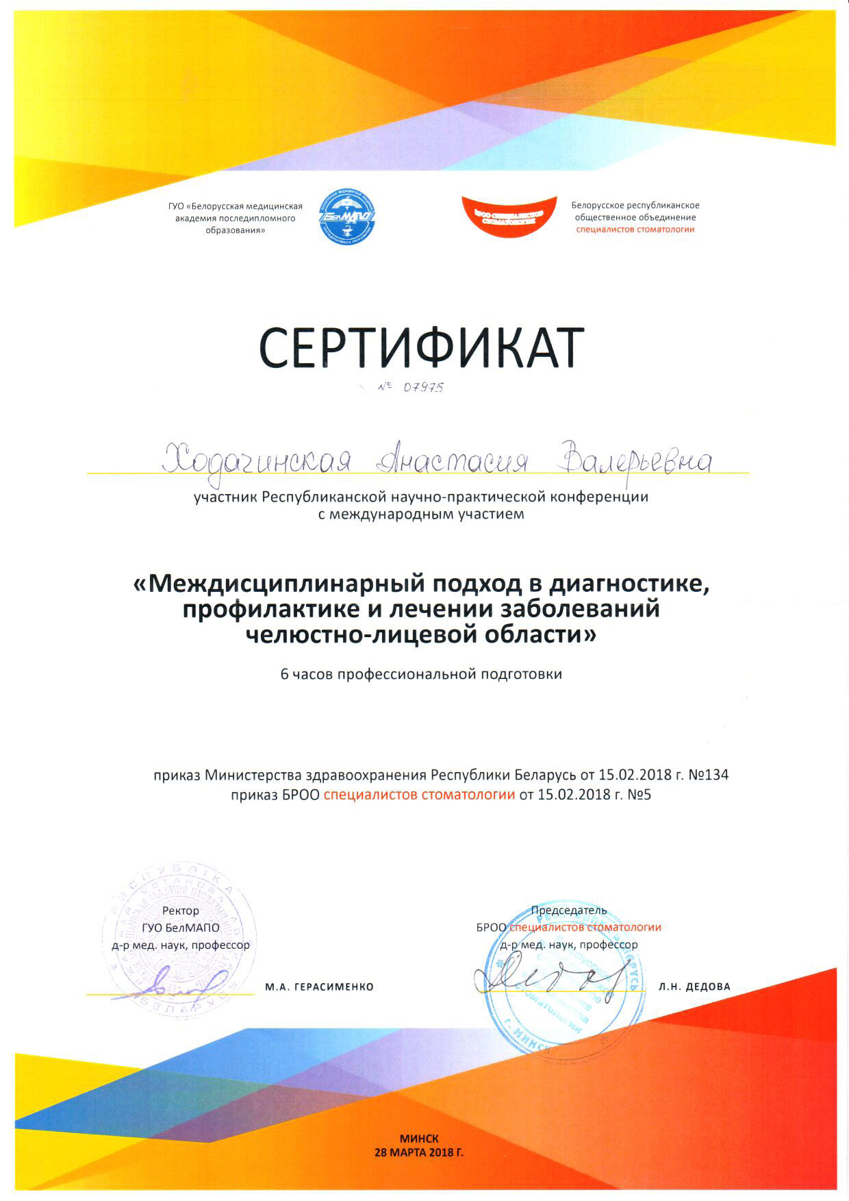 Проходила курсы повышения квалификации на базе БелМАПО«Аспекты современной эндодонтии» в феврале 2018 года.