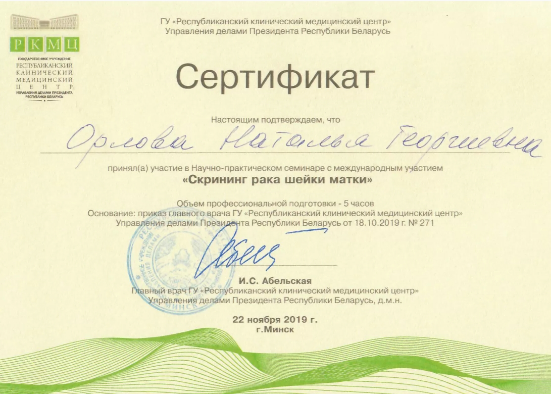 • 2015 г. — «Репродуктивное здоровье при гинекологической патологии. Высокотехнологические вмешательства (эндоскопические методы) в гинекологии. Основы УЗ-диагностики и кольпоскопии в гинекологической практике », ГУО «БелМАПО»