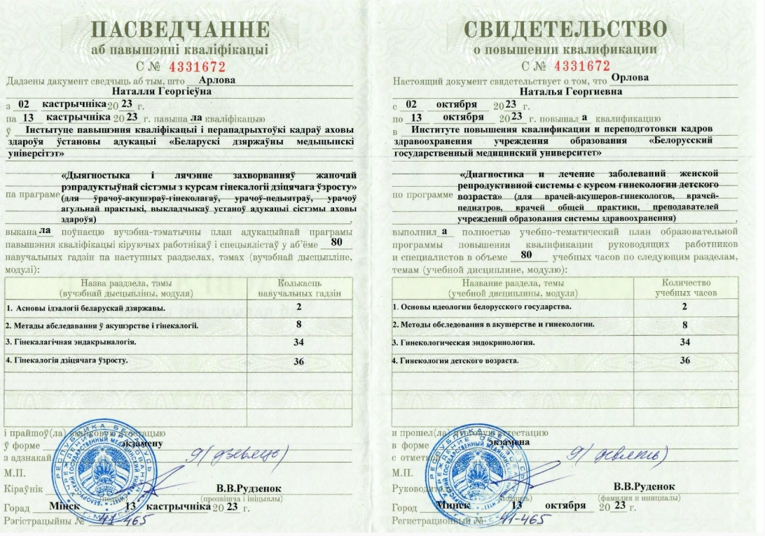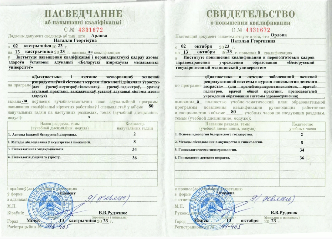• 2023 г. — «Диагностика и лечение заболеваний женской репродуктивной системы с курсом гинекологии детского возраста», УО «Белорусский государственный медицинский университет».