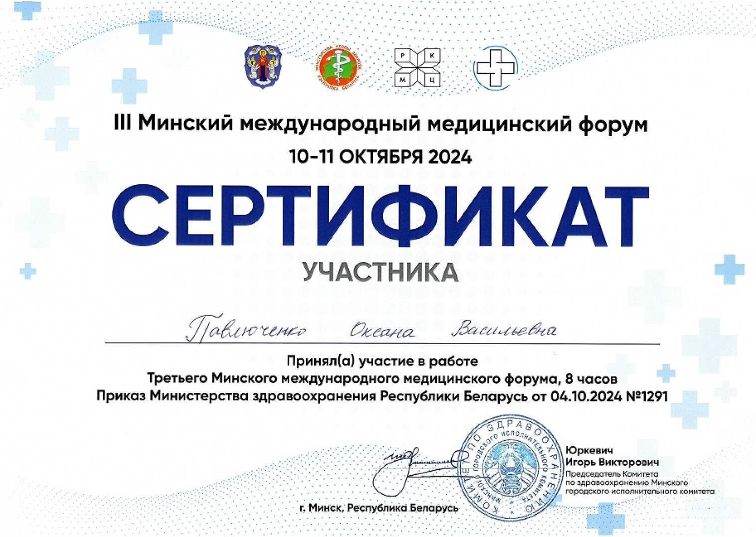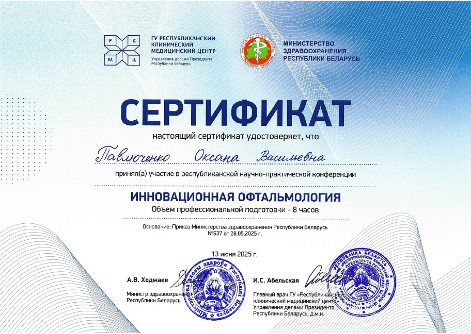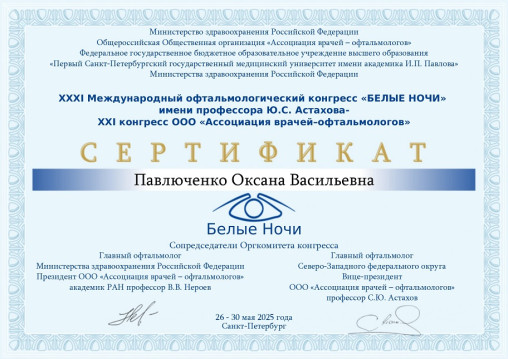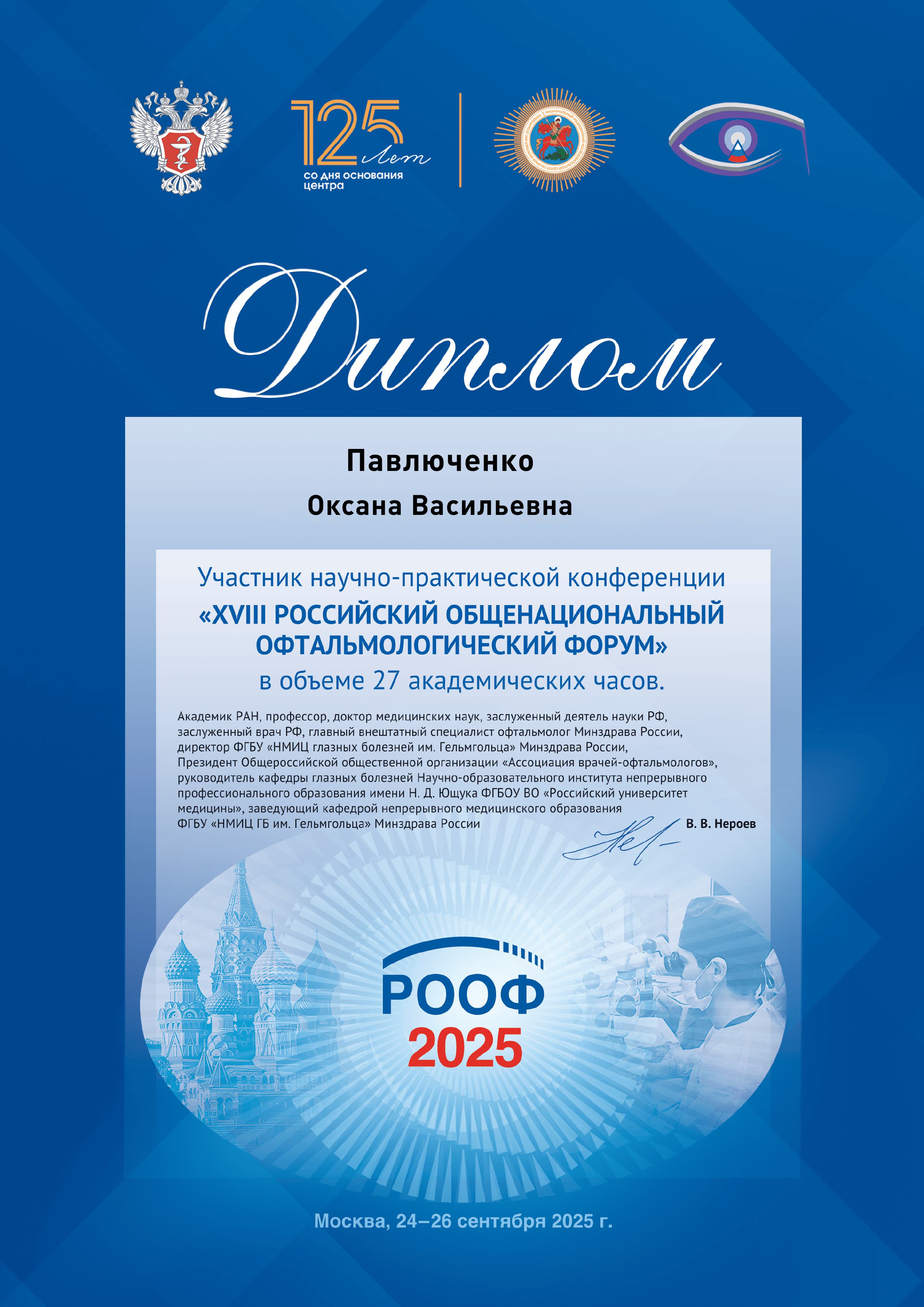 • 24–26 сентября 2025 — Участник научно-практической конференции «XVIII Российский общенациональный офтальмологический форум», г. Москва
