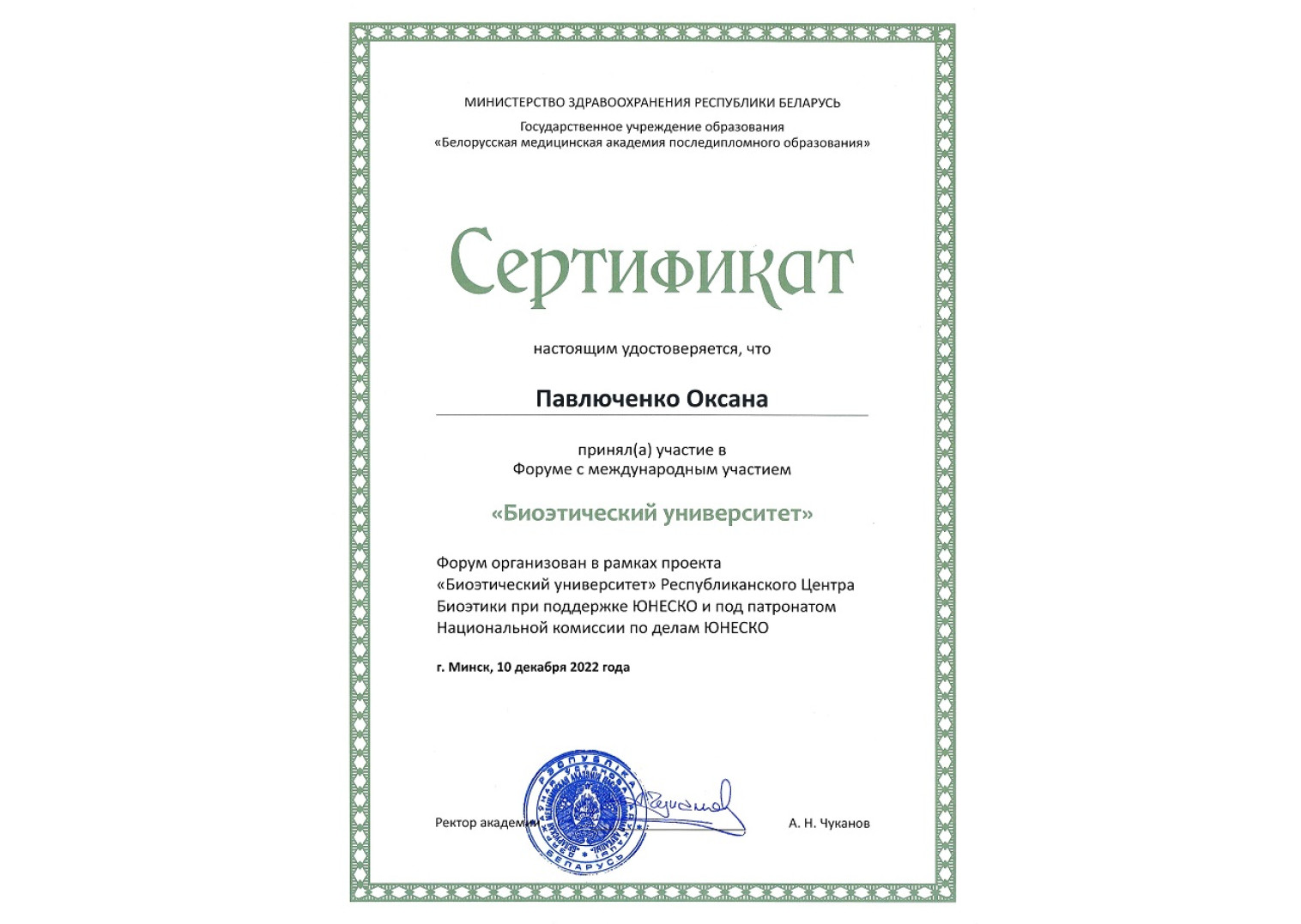 • WHO, The course on “Effective Project Planning of Biomedical Research (EPPE)” held from 22 to 25 April 2019, in the volume of 36 hours  at Belarusian Medical Academy of Postgraduate Education, Minsk, Belarus