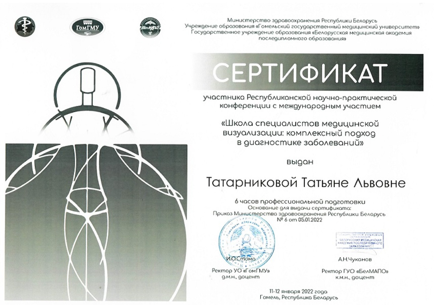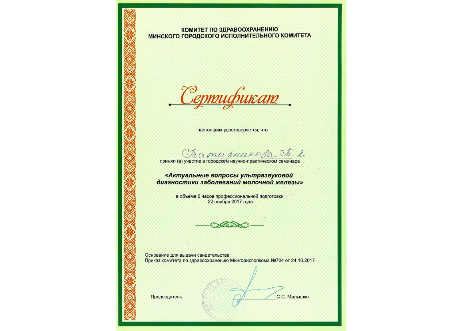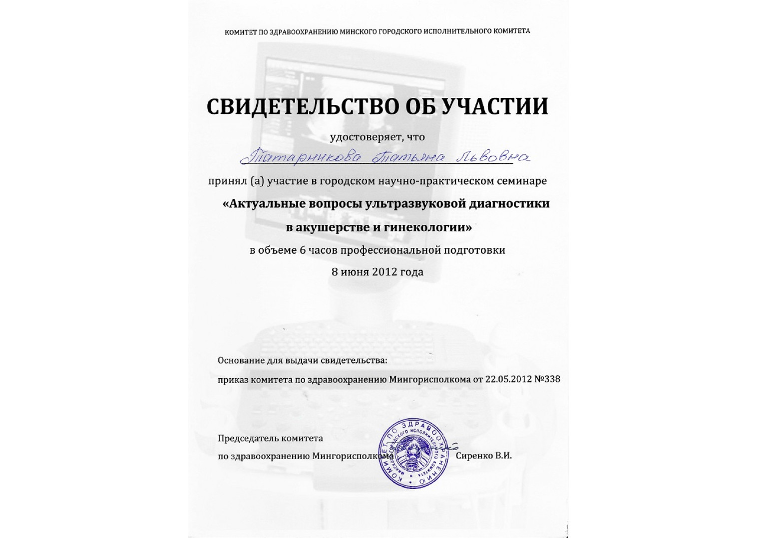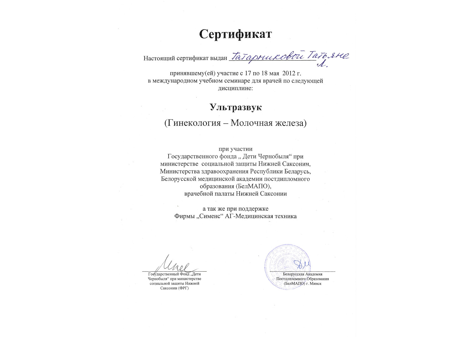 • 2012 г. — «Ультразвук (гинекология — молочная железа)», БелМАПО