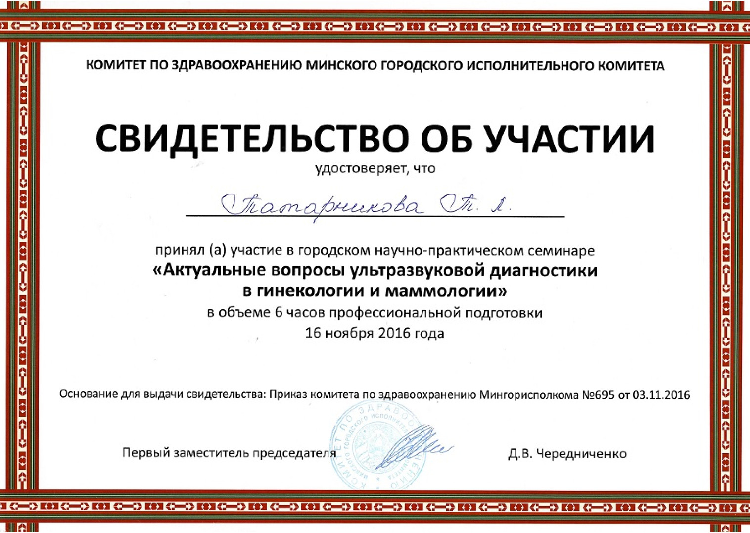 • 2016 г. — «Актуальные вопросы УЗД в гинекологии и маммологии», МККДЦ