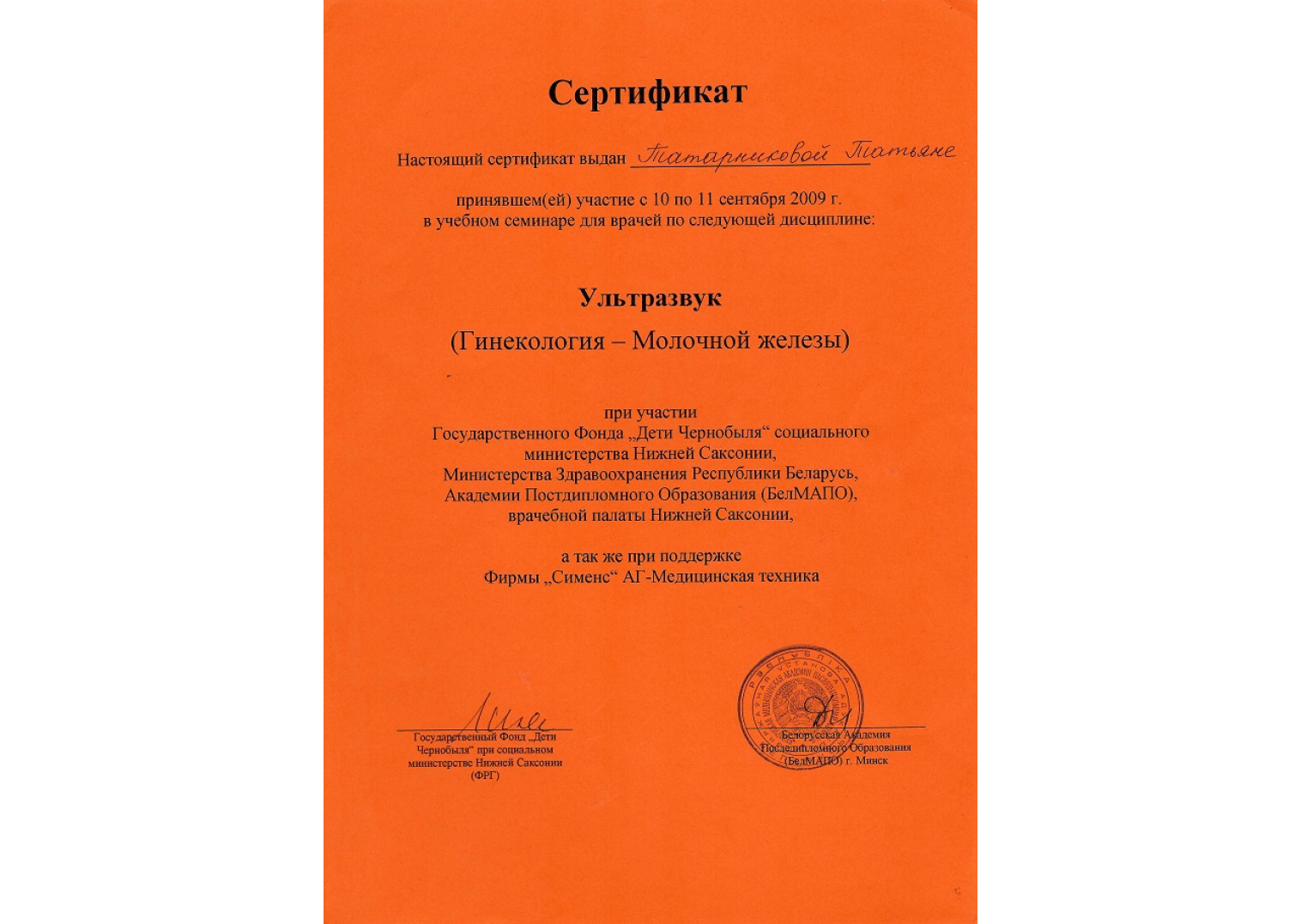 • 2009 г. — «Ультразвук (гинекология — молочная железа)», БелМАПО