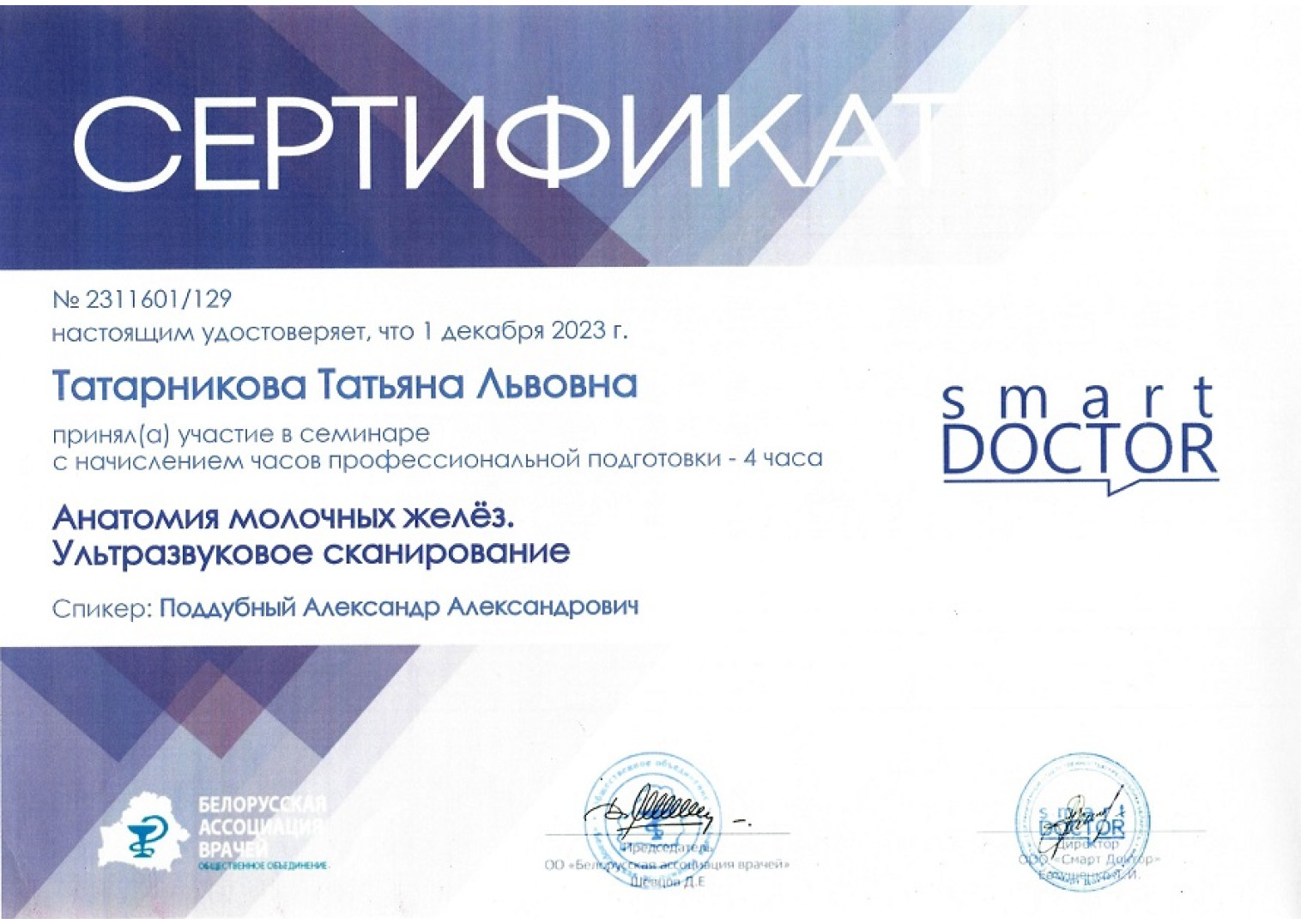 • 2023 г. — «УЗД доброкачественной и злокачественной патологии молочной железы», Белорусская Ассоциация врачей (Поддубный А. А.)