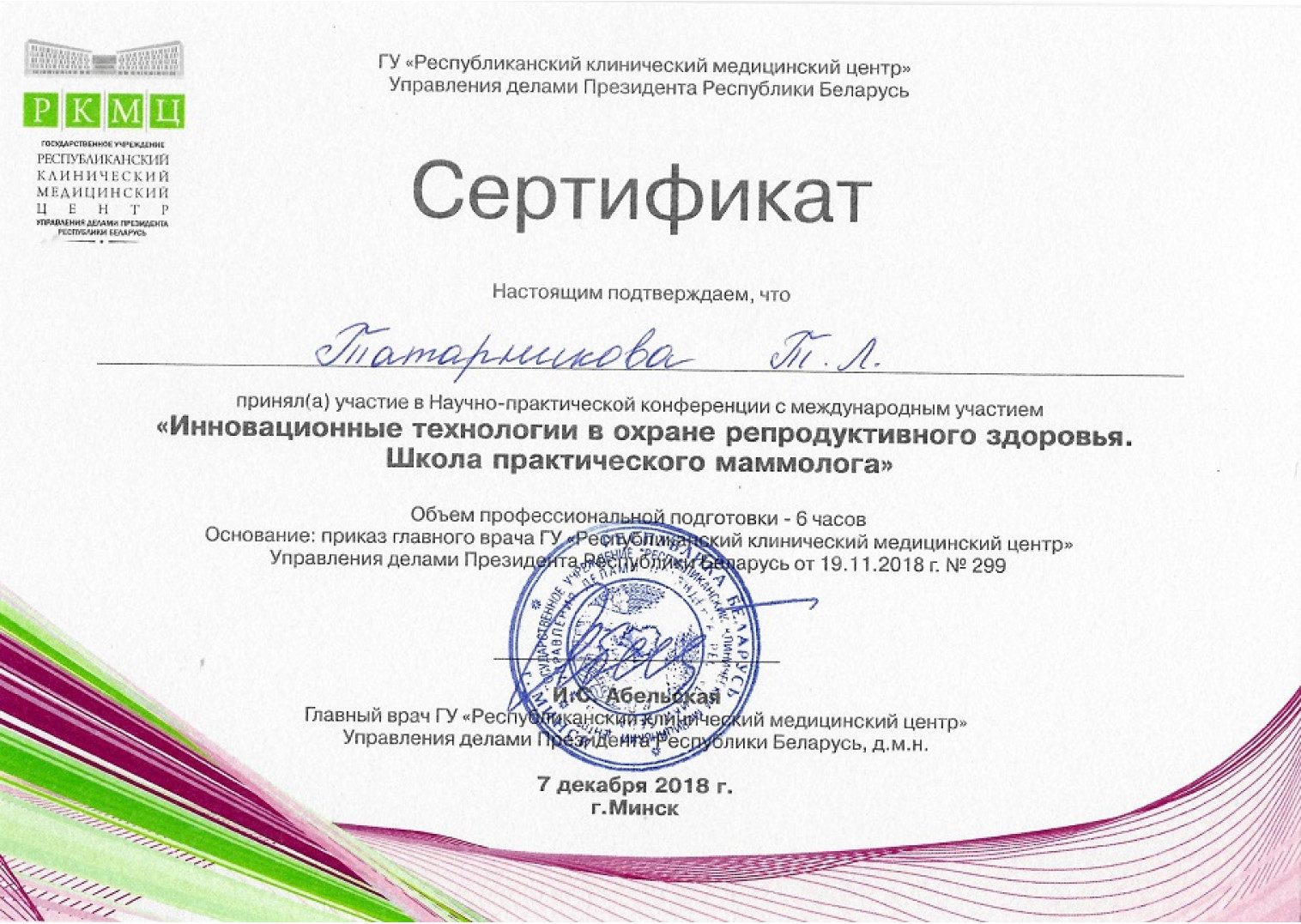 • 2018 г. — «Инновационные технологии в охране репродуктивного здоровья», ГУ «РКМЦ» Управления делами Президента РБ