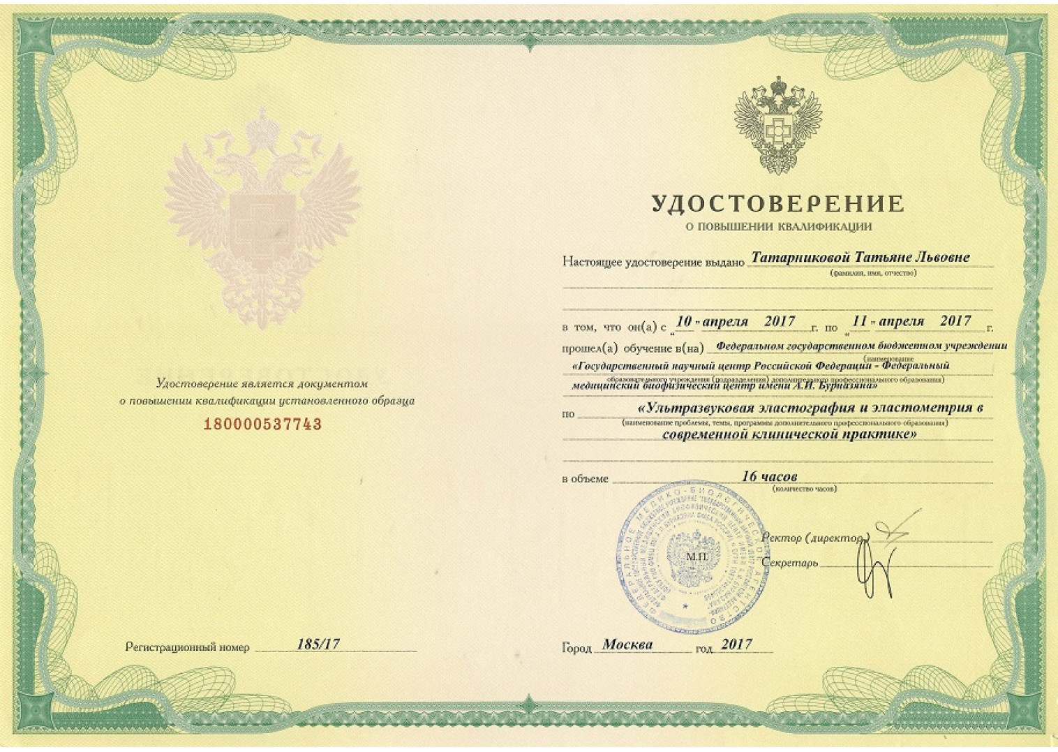 • 2010 г. — прошла переподготовку по специальности «ультразвуковая диагностика»