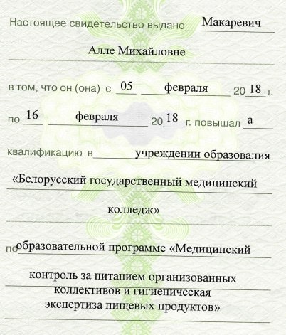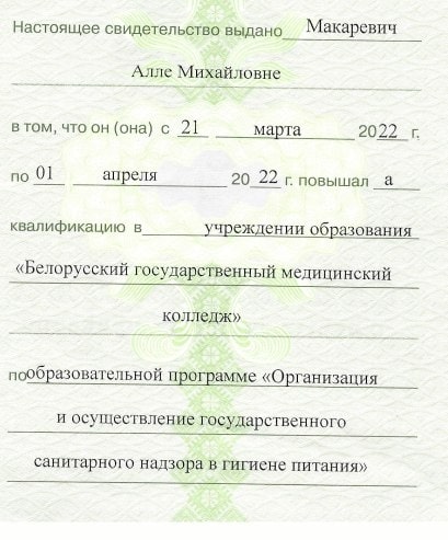 • 2013 г. — Высшая квалификационная категория, фельдшер-гигиенист, эпидемиолог