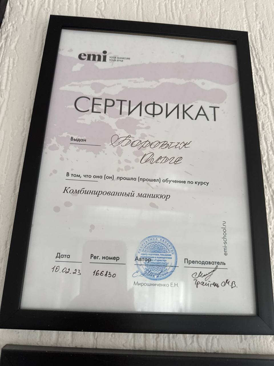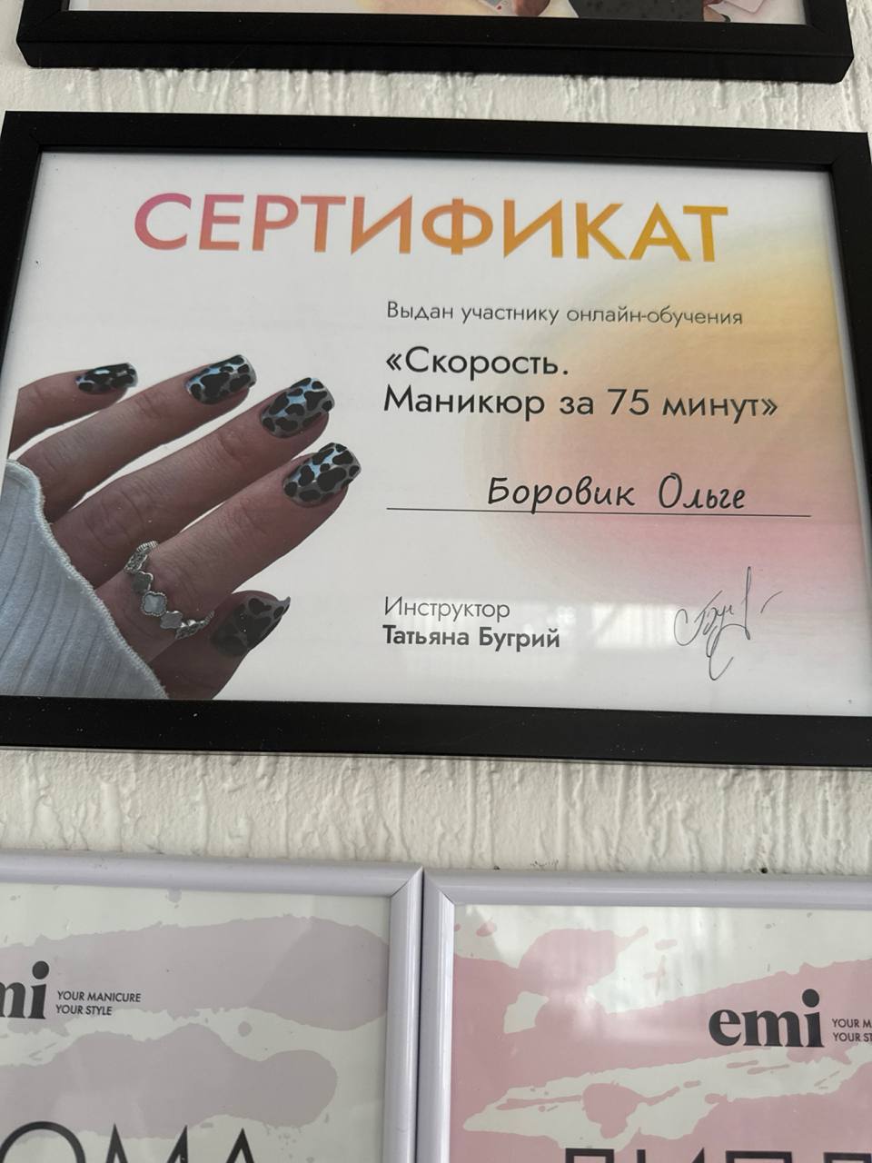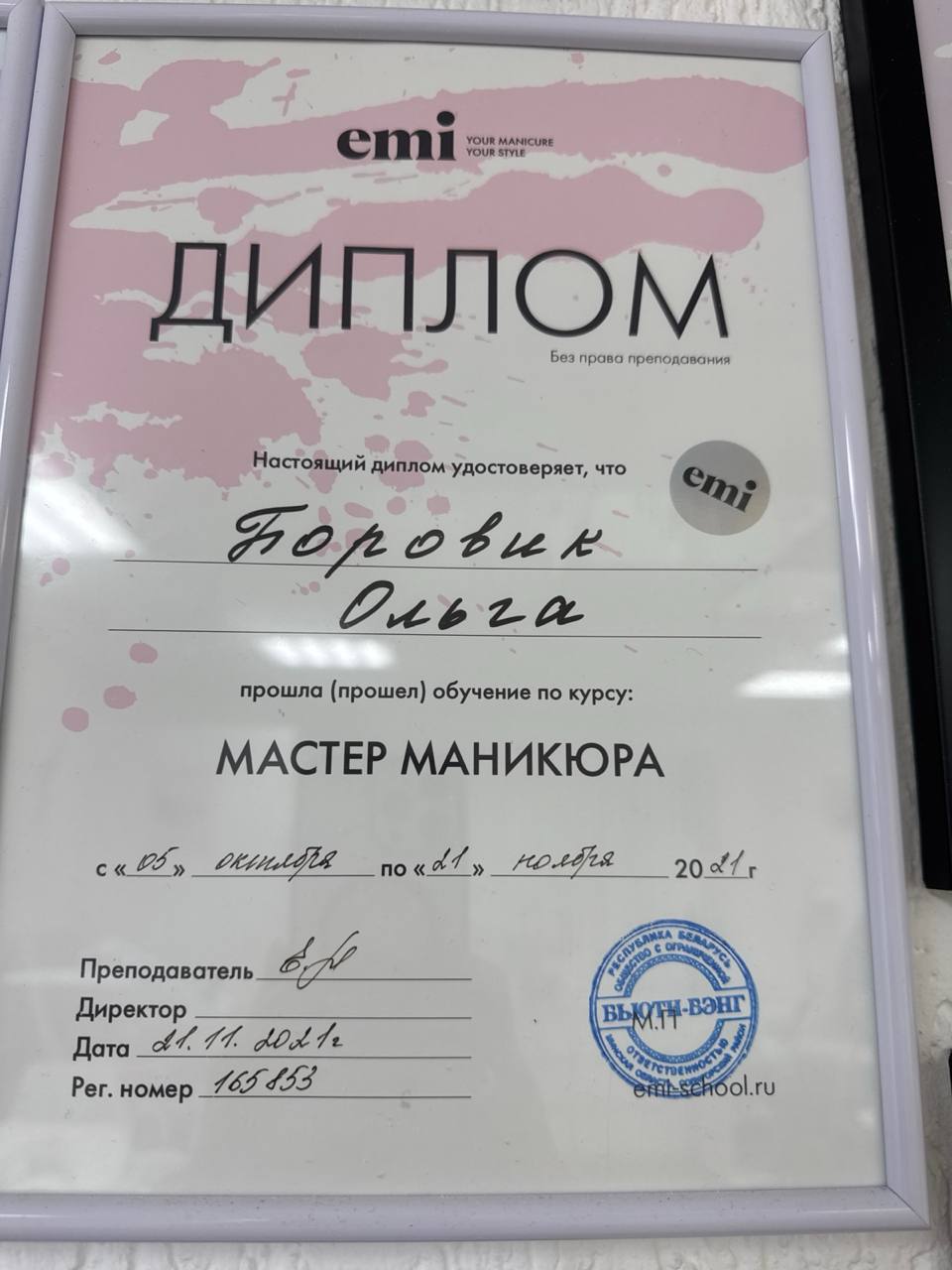 Огромное спасибо мастеру Ольге за безупречный маникюр! Вы настоящая волшебница и профессионал своего дела! Особенно ценн...о аккуратность и стерильность, чувствую себя в полной безопасности. Четкие линии, идеально ровное покрытие, никаких подтеков. Маникюр держится минимум 3-4 недели без сколов и повреждений. Выхожу от вас с идеальными ноготками и прекрасным настроением! Если вы цените уникальность и качество - вам точно к Ольге. Всем сердцем рекомендую! Спасибо за вашу работу