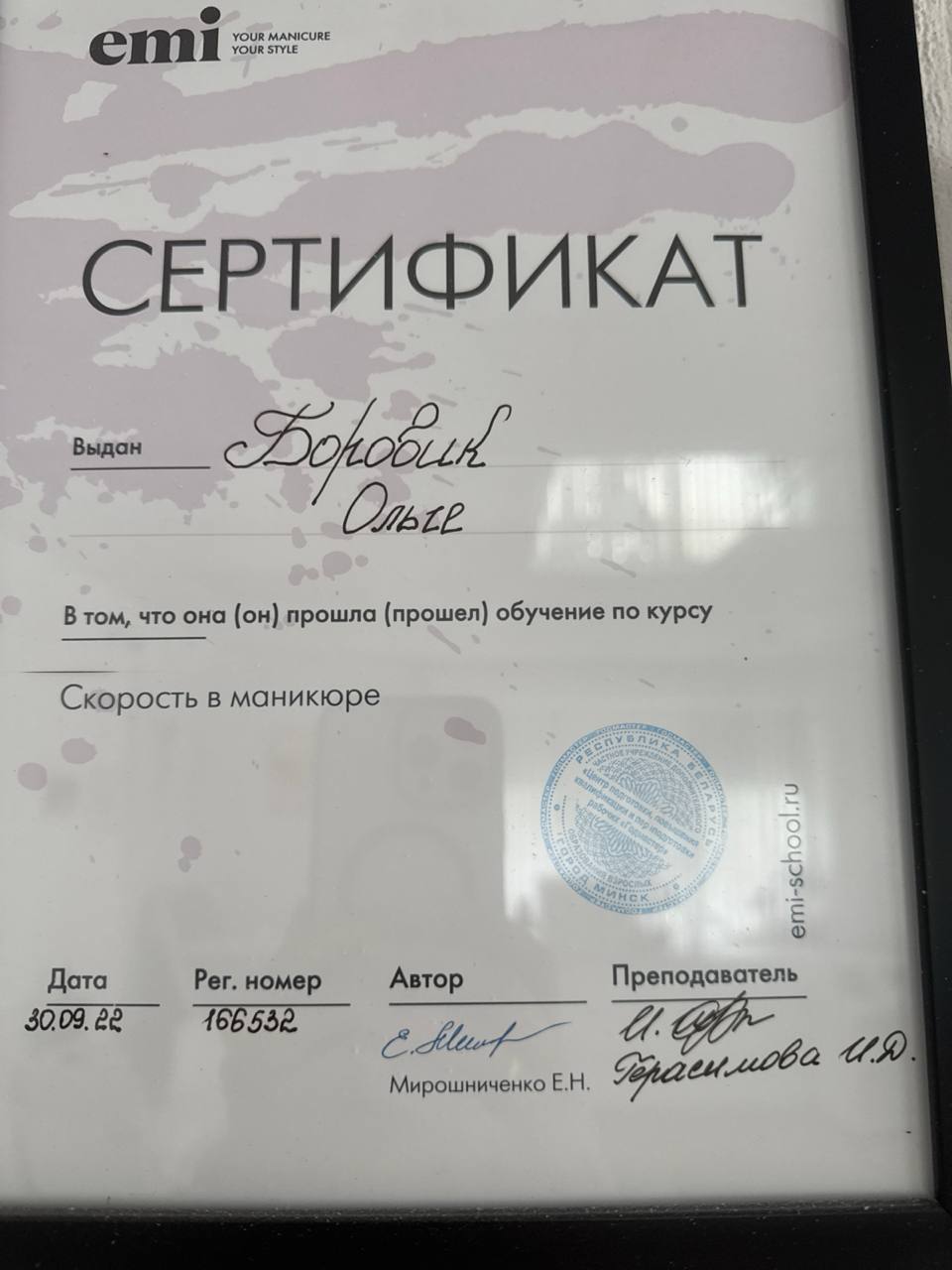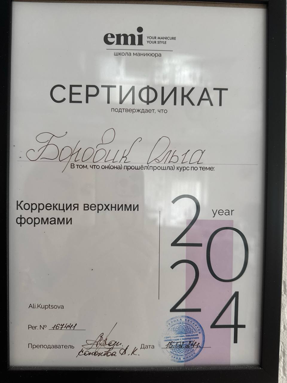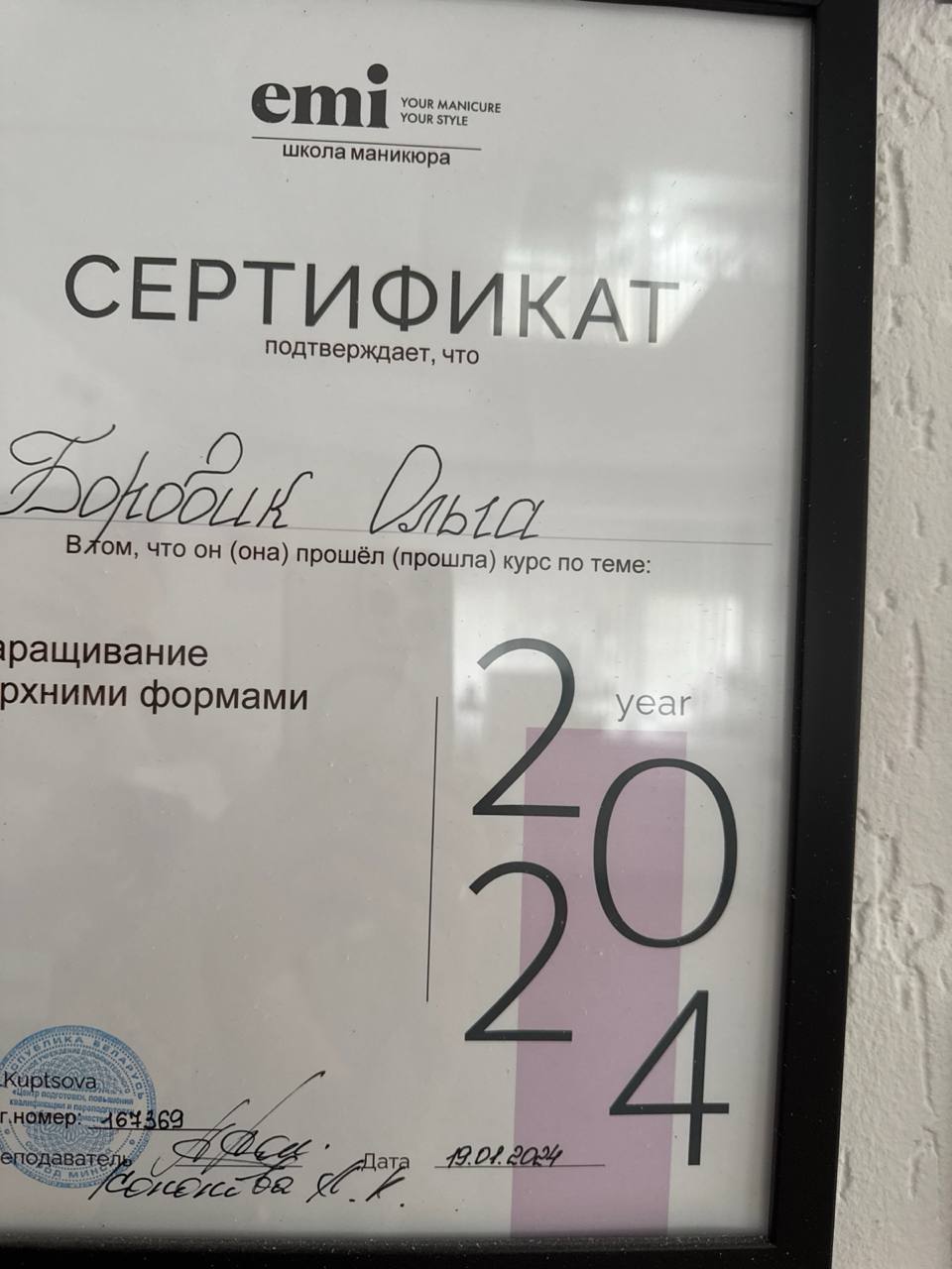 Огромное спасибо мастеру Ольге за безупречный маникюр! Вы настоящая волшебница и профессионал своего дела! Особенно ценн...о аккуратность и стерильность, чувствую себя в полной безопасности. Четкие линии, идеально ровное покрытие, никаких подтеков. Маникюр держится минимум 3-4 недели без сколов и повреждений. Выхожу от вас с идеальными ноготками и прекрасным настроением! Если вы цените уникальность и качество - вам точно к Ольге. Всем сердцем рекомендую! Спасибо за вашу работу
