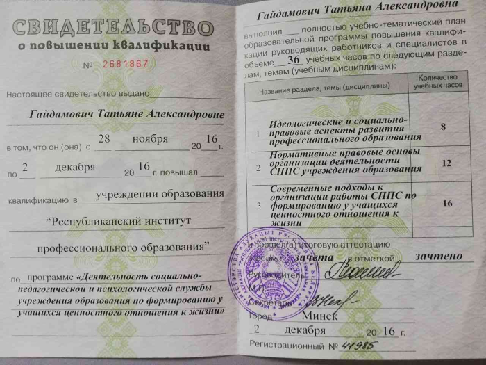 • 2024–2025 гг. — педагог-психолог, ВГКЛПиТ, г. Витебск