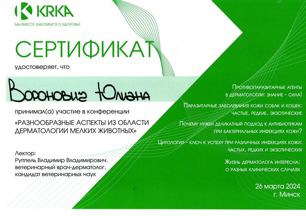 • март 2024 г. — конференция «Разнообразные аспекты из области дерматологии мелких животных», г. Минск,