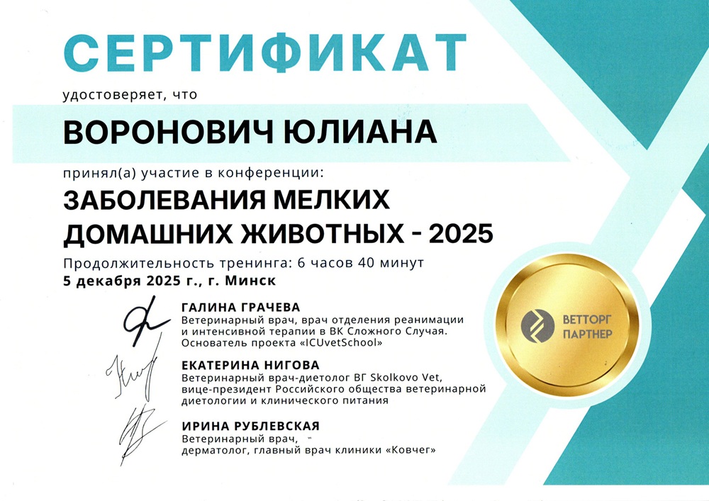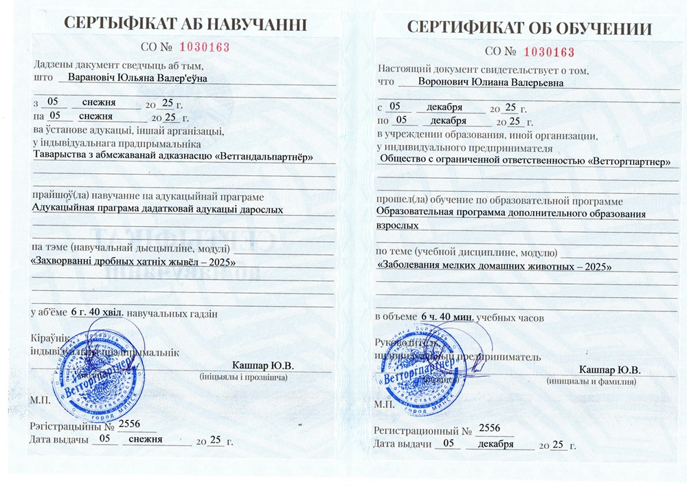• декабрь 2025 г. — семинар «Заболевания мелких домашних животных-2025», г. Минск.