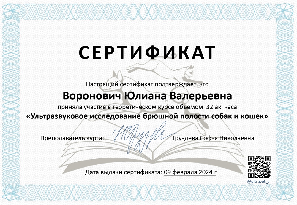 • февраль 2024 г. — курс «Ультразвуковое исследование брюшной полости собак и кошек», Ультраветс,