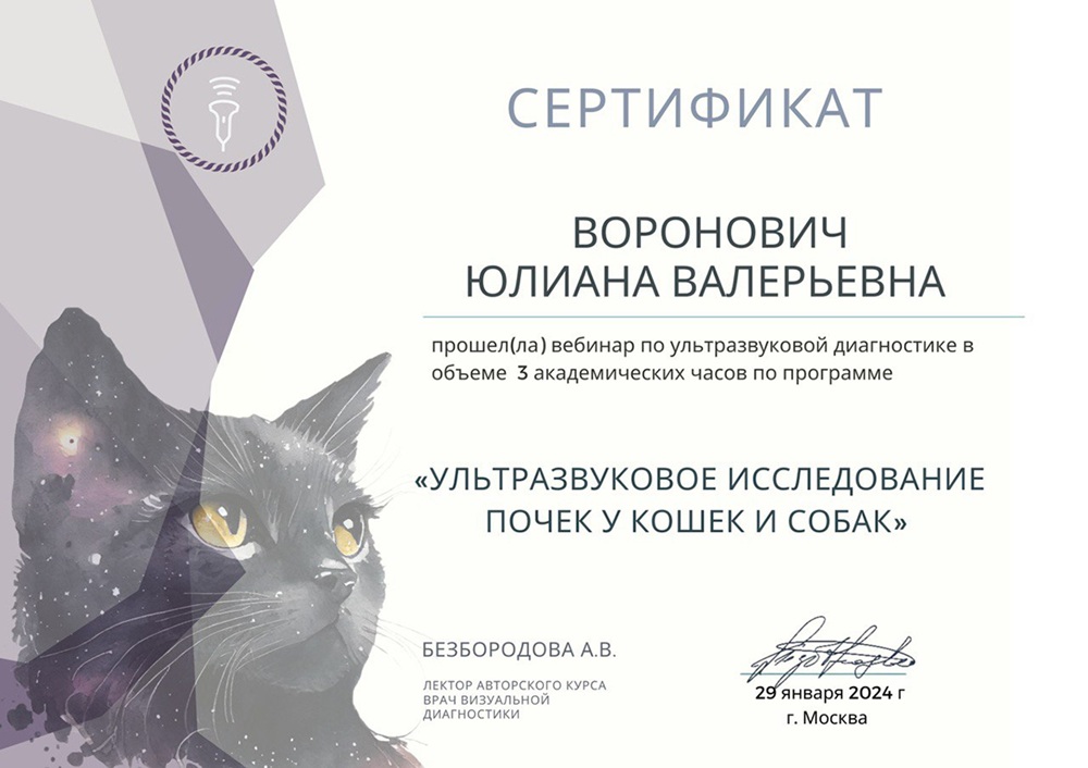 • январь 2024 г. — вебинар «Ультразвуковое исследование почек у кошек и собак», авторский курс Безбородовой А.В., г. Москва,