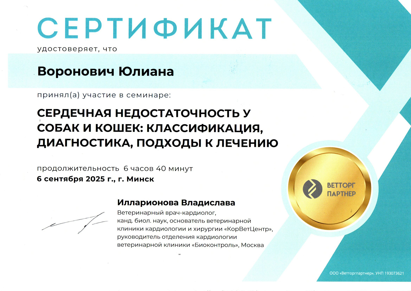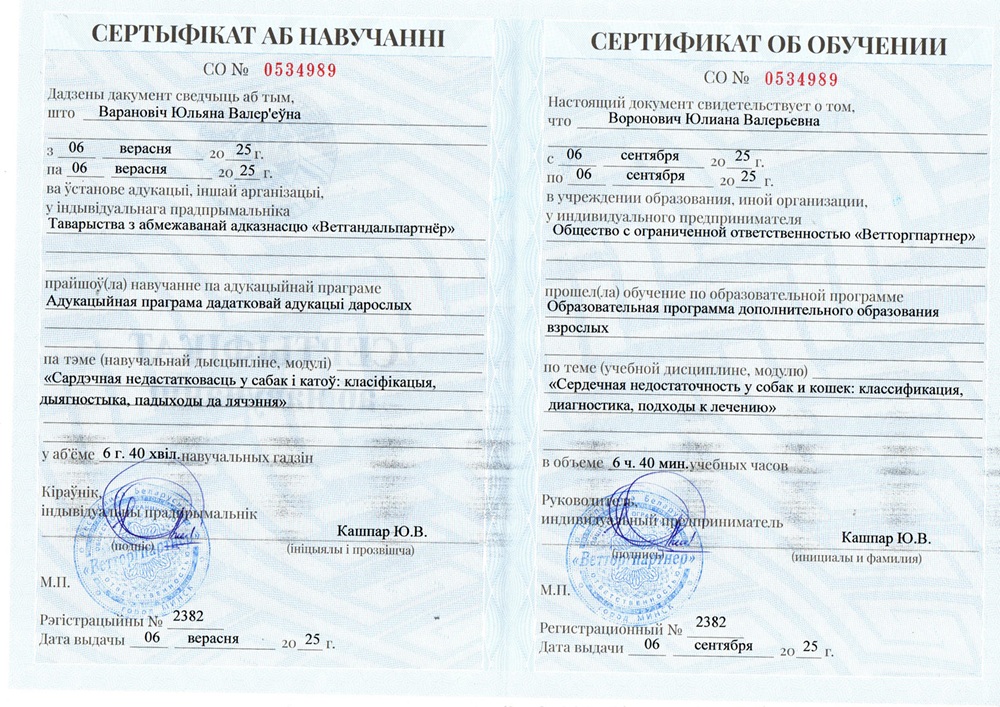• сентябрь 2025 г. — семинар «Сердечная недостаточность у собак и кошек: классификация, диагностика, подходы к лечению», г. Минск,