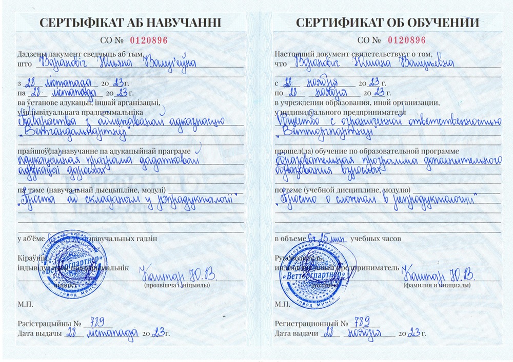 • 2018 г. — окончила аспирантуру по специальности «Кормление с\х животных и технология кормов» Витебской государственной академию ветеринарной медицины.
