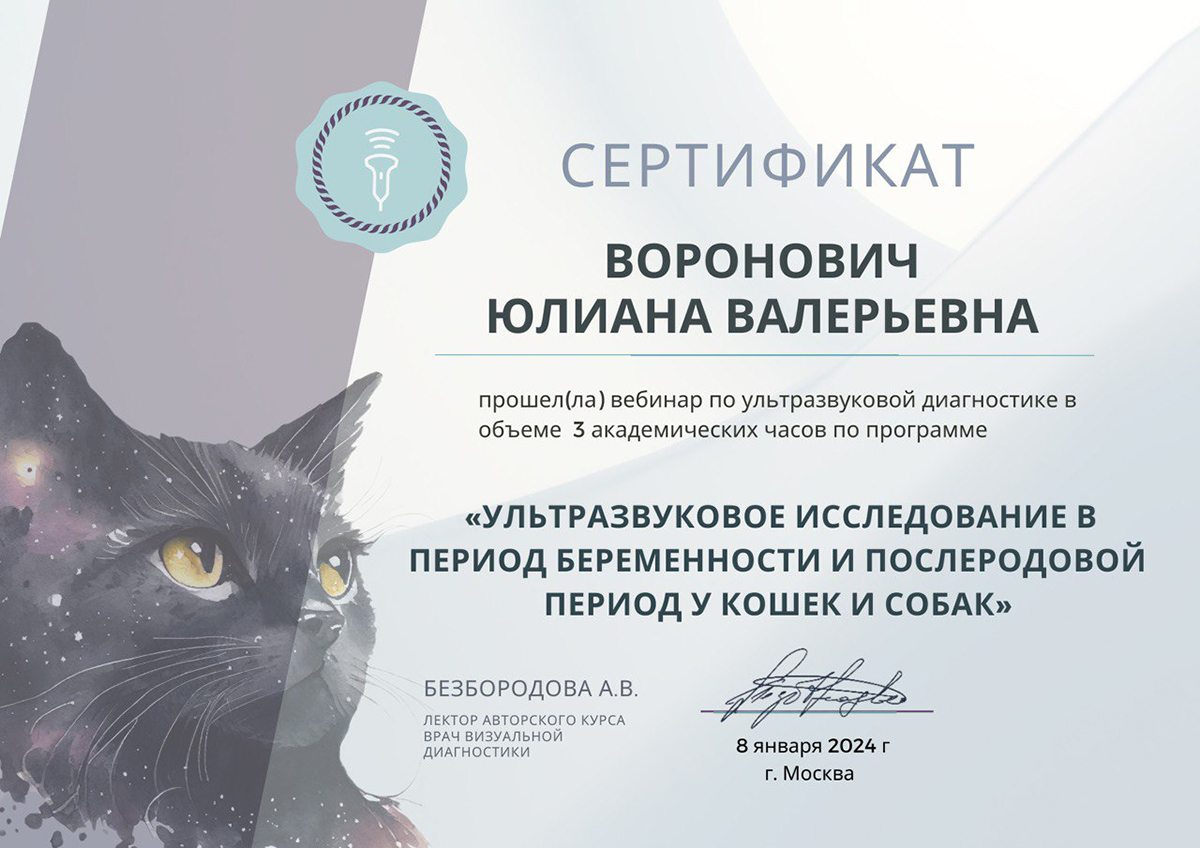 • январь 2024 г. — вебинар «Ультразвуковое исследование в период беременности и послеродовой период у кошек и собак», авторский курс Безбородовой А.В., г. Москва,
