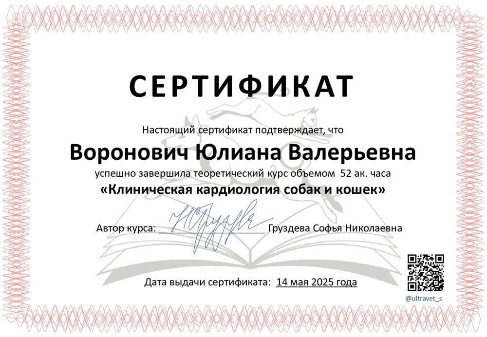 • май 2025 г. — курс «Клиническая кардиология собак и кошек», Ультраветс,