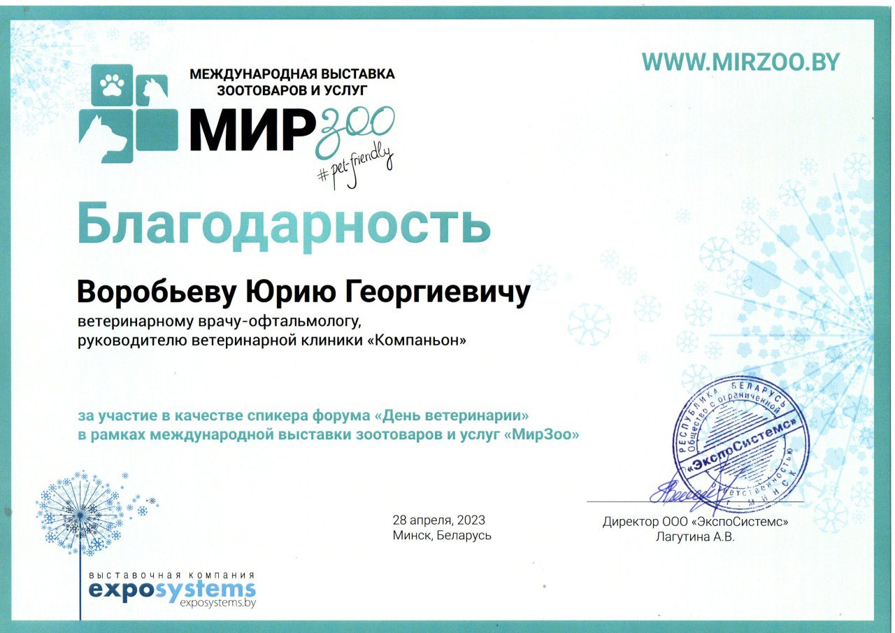 • апрель 2023 г. — в качестве спикера выступил с докладом «Протрузия глазного яблока. Как помочь?» на форуме «День ветеринарии» в рамках международной выставки «МирЗоо», г. Минск,