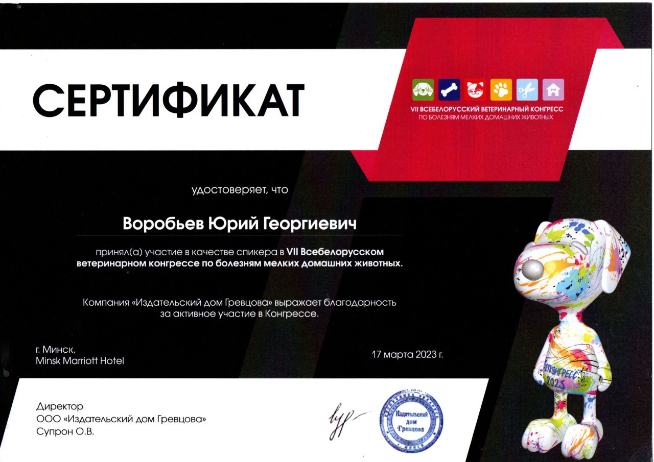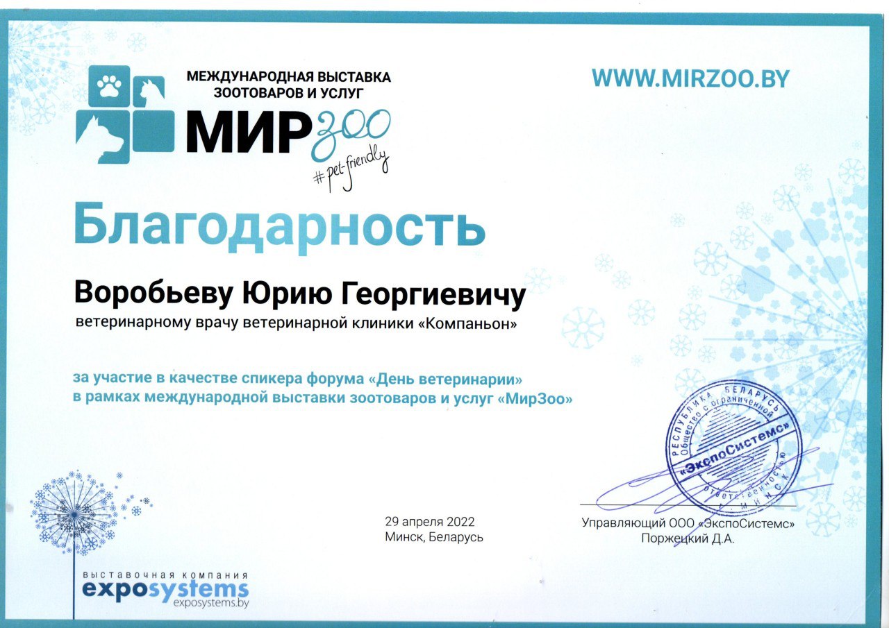 • апрель 2022 г. — в качестве спикера выступил с докладом «Слезотечение у мелких собак. Почему и что делать?» на форуме «День ветеринарии» в рамках международной выставки «МирЗоо», г. Минск,