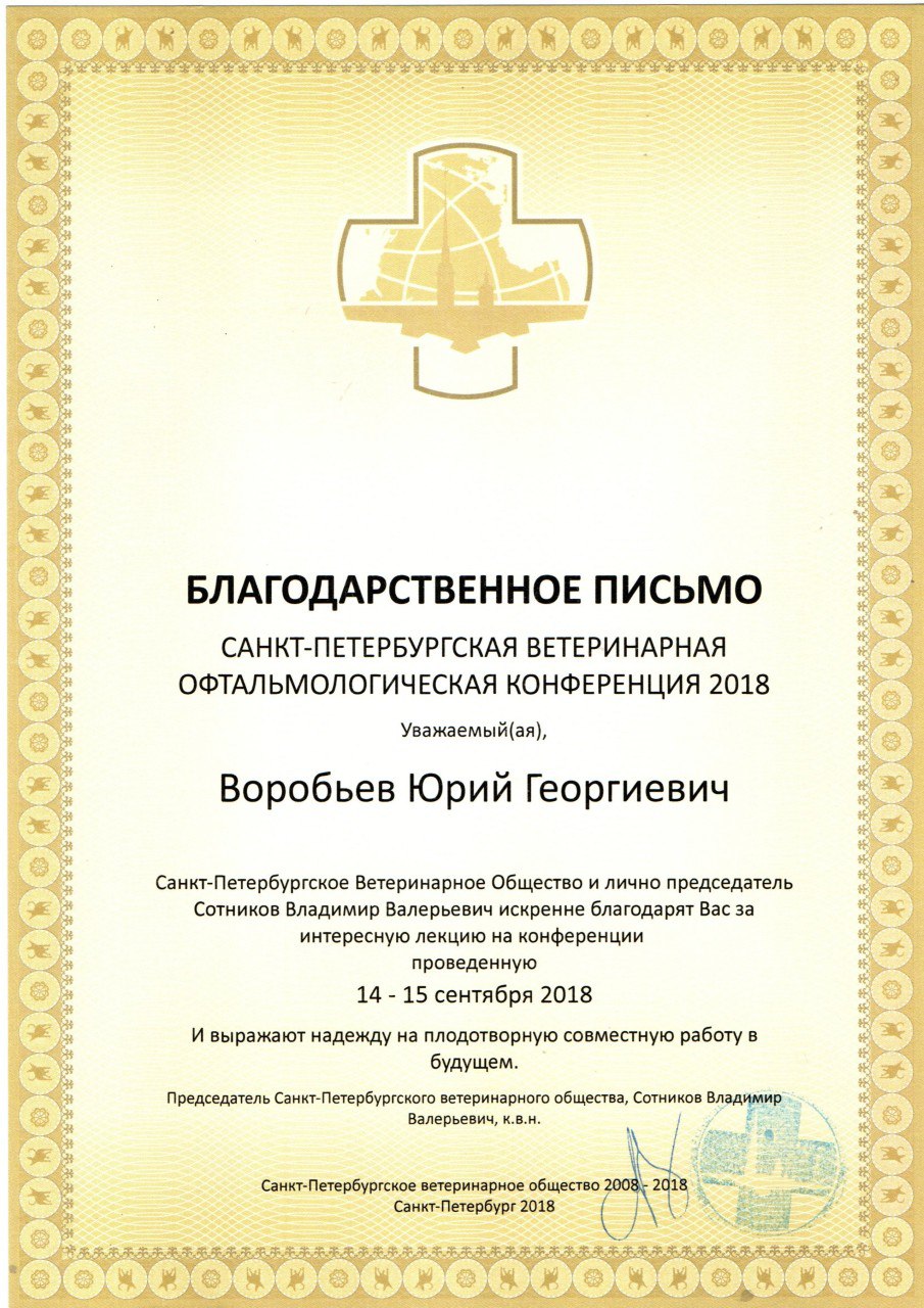 • сентябрь 2018 г. — в качестве лектора выступил с докладом «Интрасклеральное протезирование» на ветеринарной офтальмологической конференции, г. Санкт Петербург,