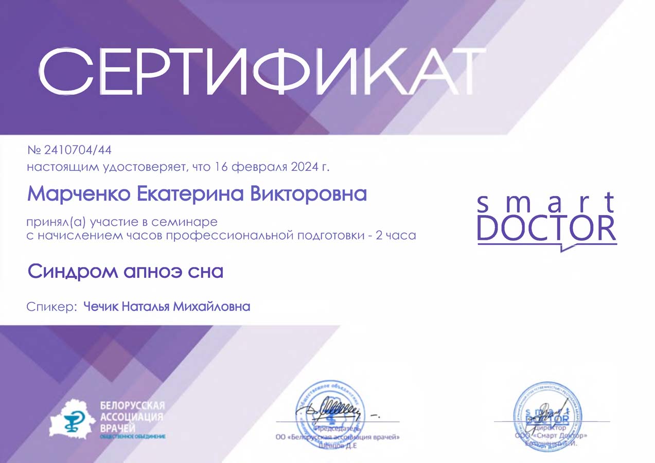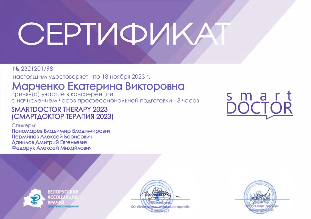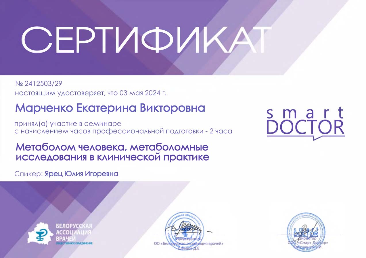 • 2021 г. — Курсы повышения квалификации по программе «Основы медицинской экспертизы, оценки качества оказания медицинской помощи и проведения медицинских экспертиз»